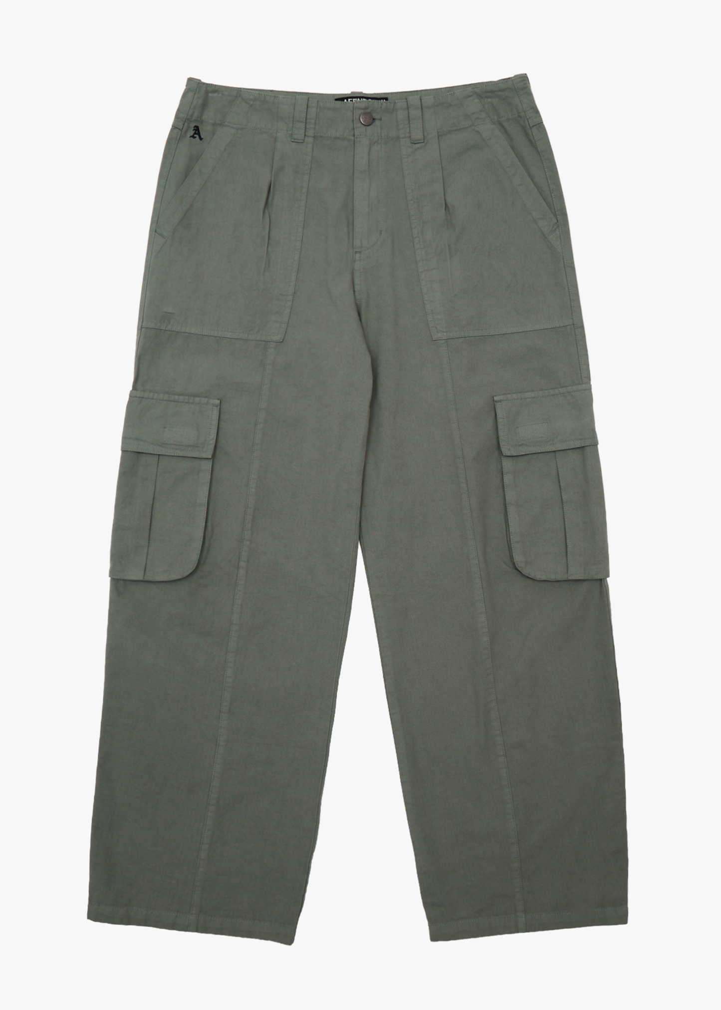 Summit Pleated Cargo Pant with a wide, baggy leg that tapers at the hem. Front pleats and centre-front panel seams give a premium tailored look. Belt looped waist, slash side pockets, and oversized cargo pockets with velcro closures. Made from a slub textured recycled cotton blend.
