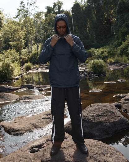 The System Anorak is a lightweight, water-repellent pullover designed to block wind and offer ultimate portability, folding neatly into its chest pocket for easy packing. Made from 100% recycled materials, it features adjustable elements, hidden zip pockets, and sleek embroidered branding, blending practicality with eco-conscious style.