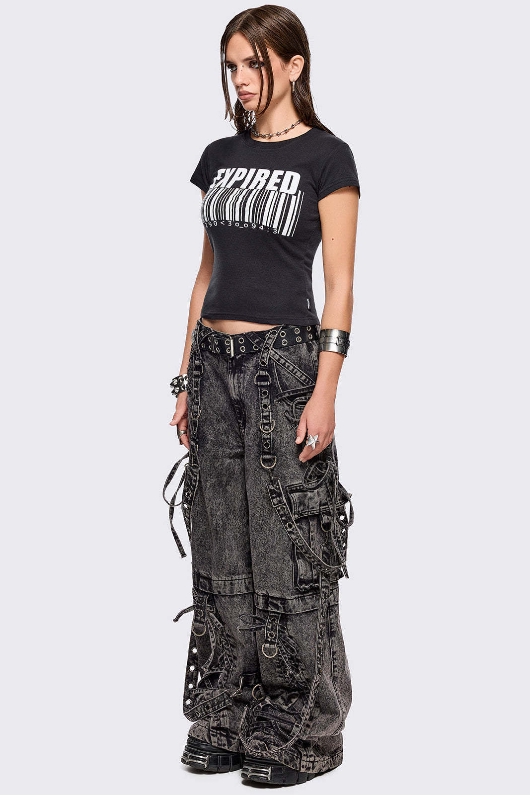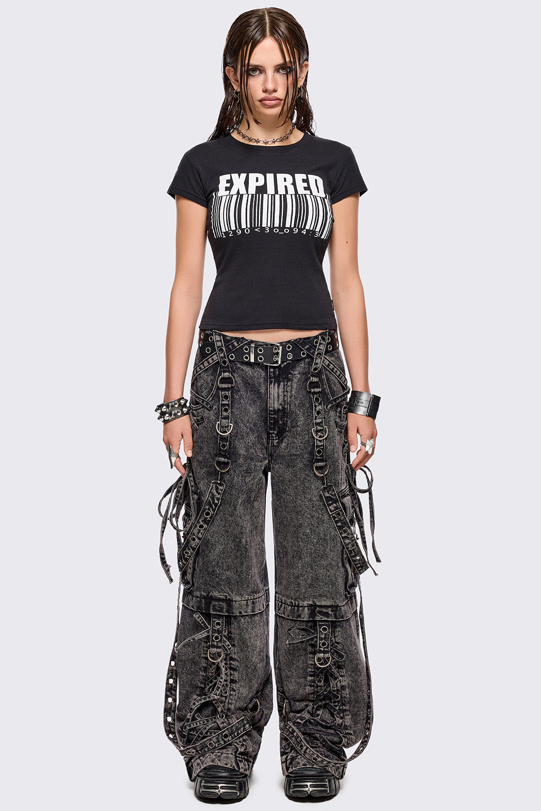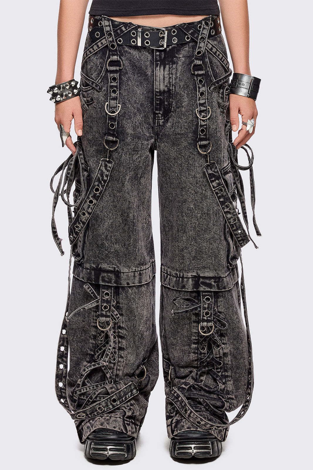 - All over strap, D-ring and lace up details