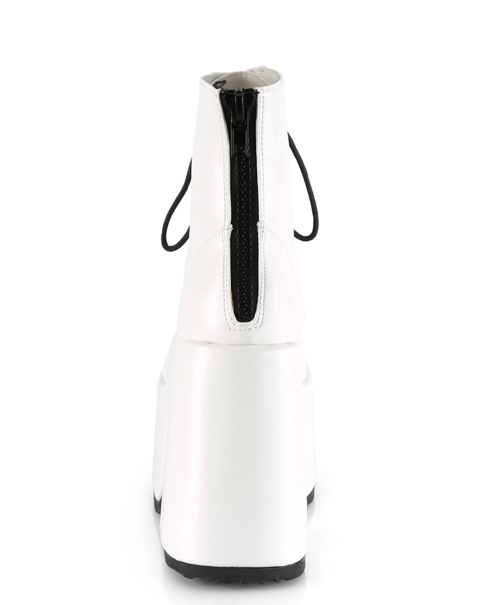 The Camel-203 ankle boots redefine bold style with a touch of white-hot flair. These vegan-friendly powerhouses pair a commanding 5" chunky heel with a robust 3" platform, guaranteeing you'll rise above the crowd. Lacing up for a custom fit and zipping up for quick access, these boots are the epitome of both practicality and edgy aesthetics. Whether you're a moonlight raver or a daytime rebel, these boots are your perfect accomplice.