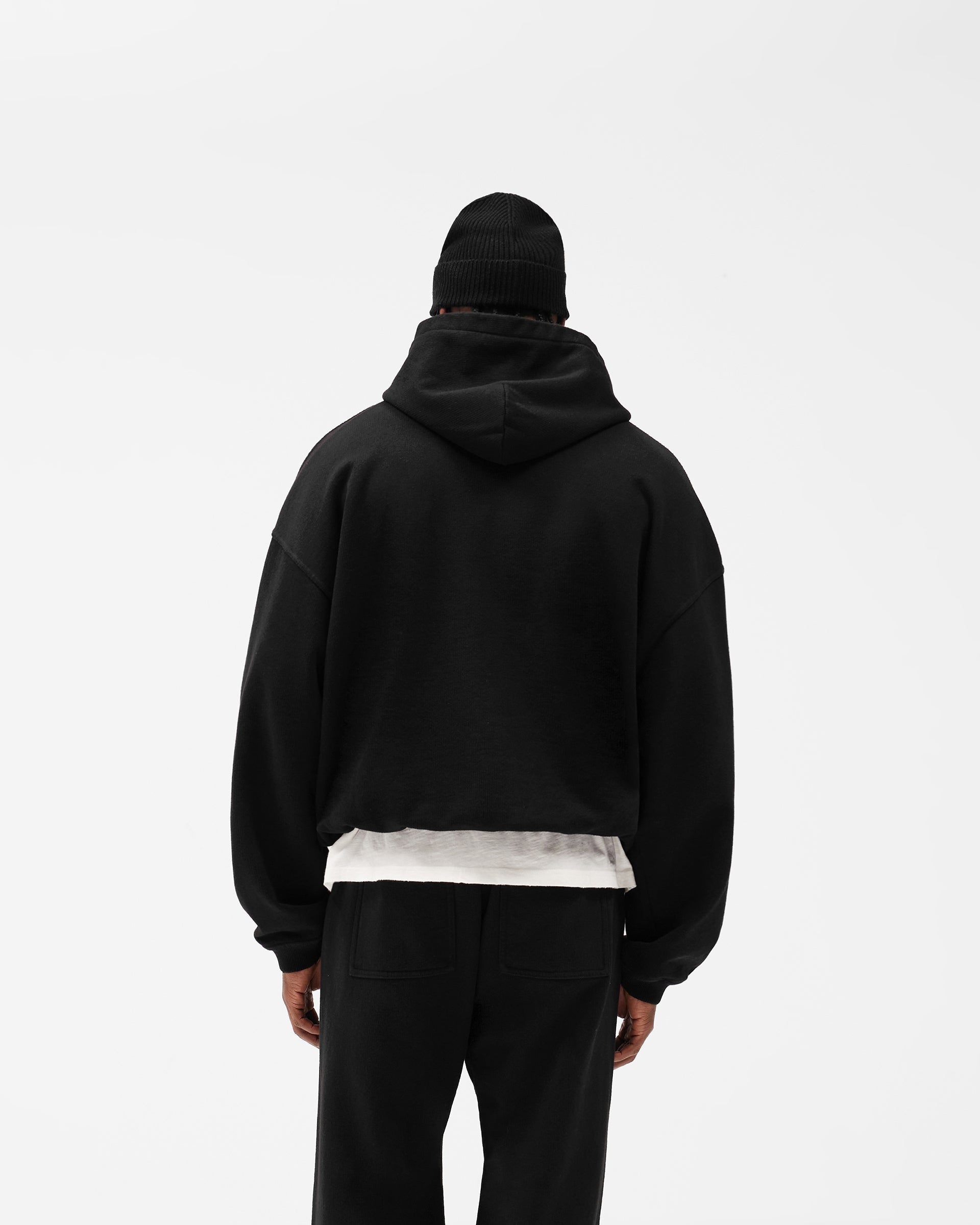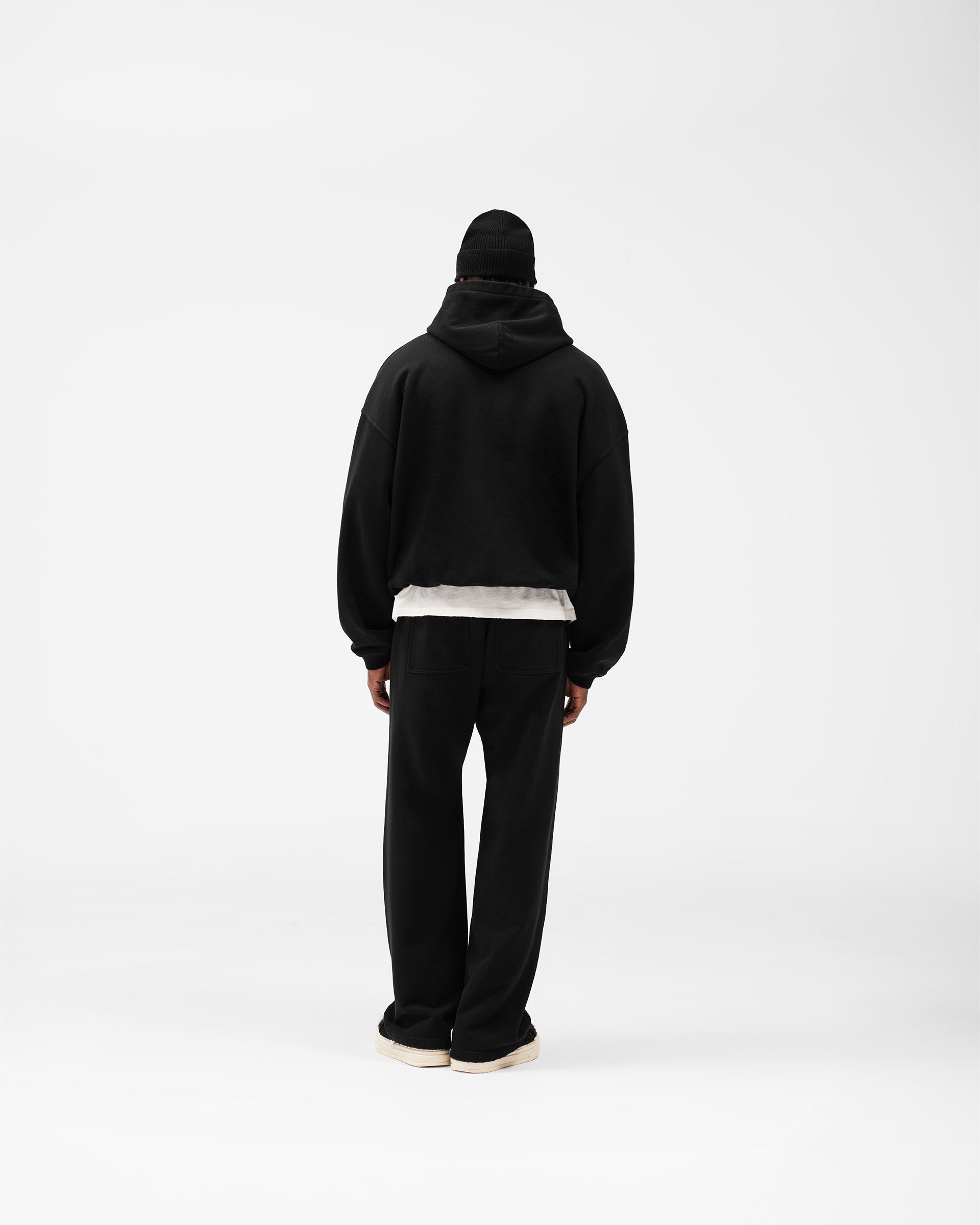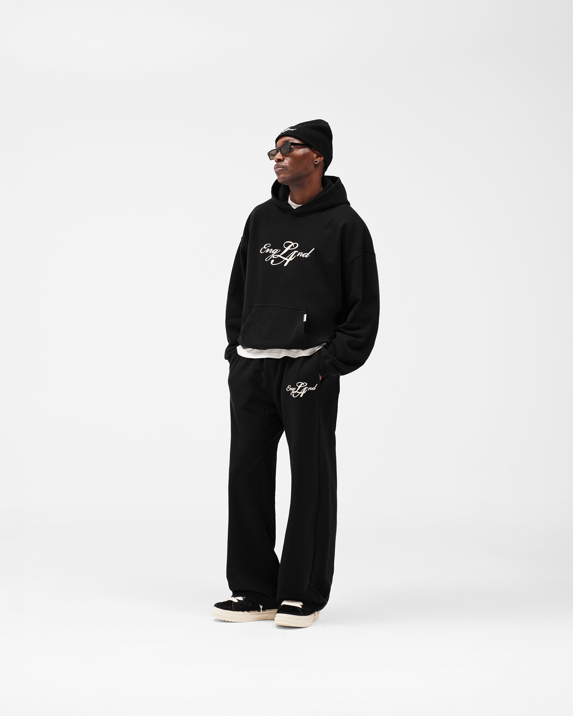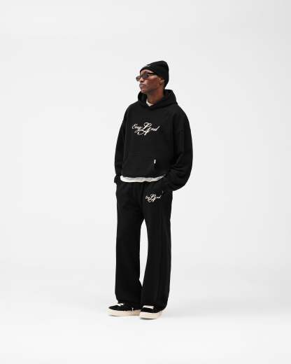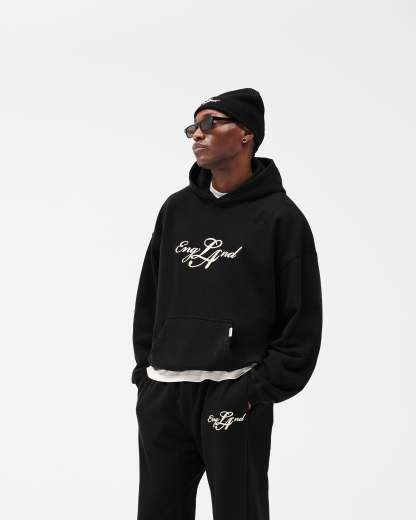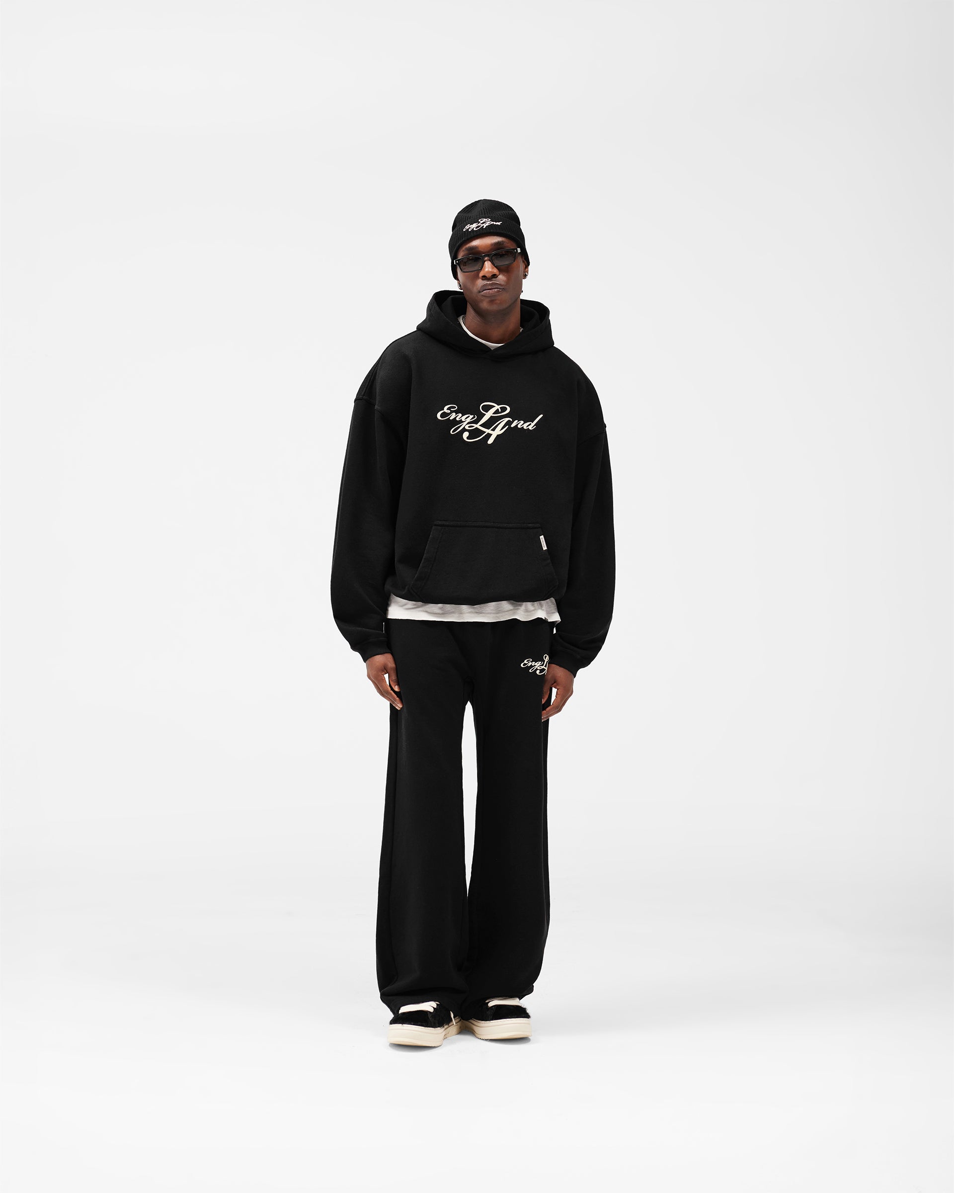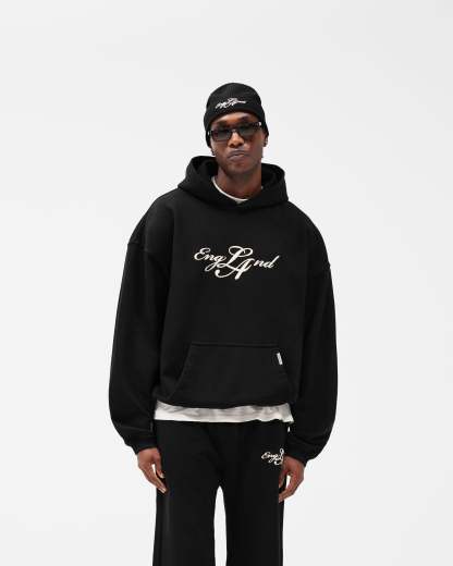 Introducing the EngLAnd Hoodie in Jet Black, crafted with a relaxed oversized silhouette and a drawn-in waistband for a refined vintage shape. Made from 370gsm loopback cotton, it carries a soft, washed handfeel that enhances everyday wear. The hoodie features a double layer hood, kangaroo pocket and chain stitch EngLAnd embroidery across the chest, finished with subtle distressing to the cuffs and hem for a naturally worn look.