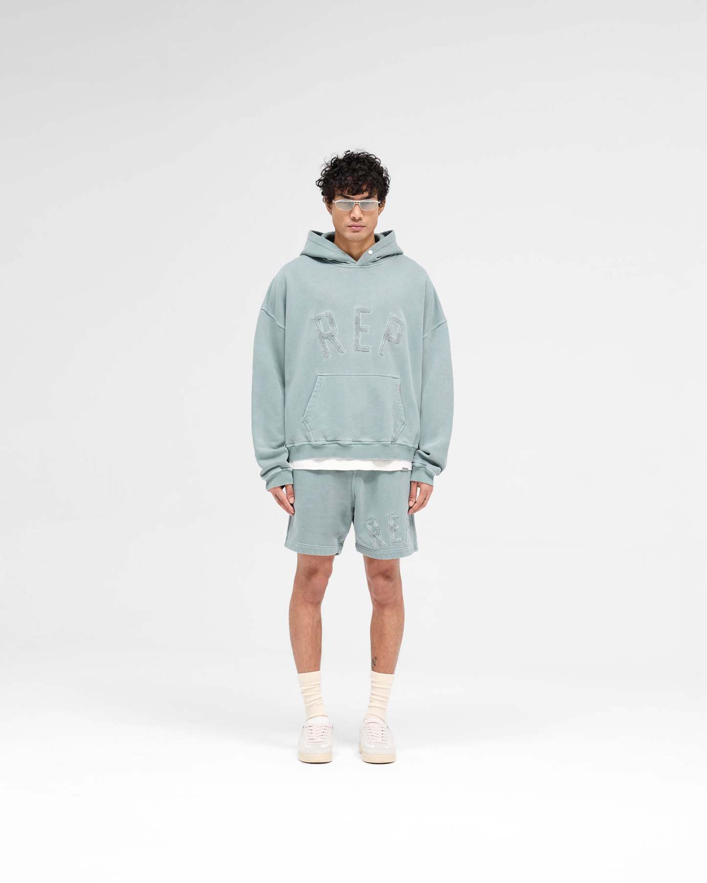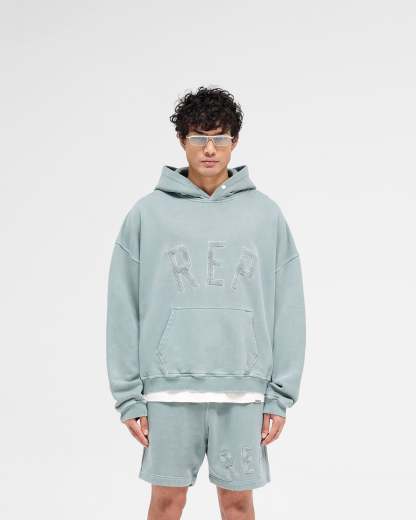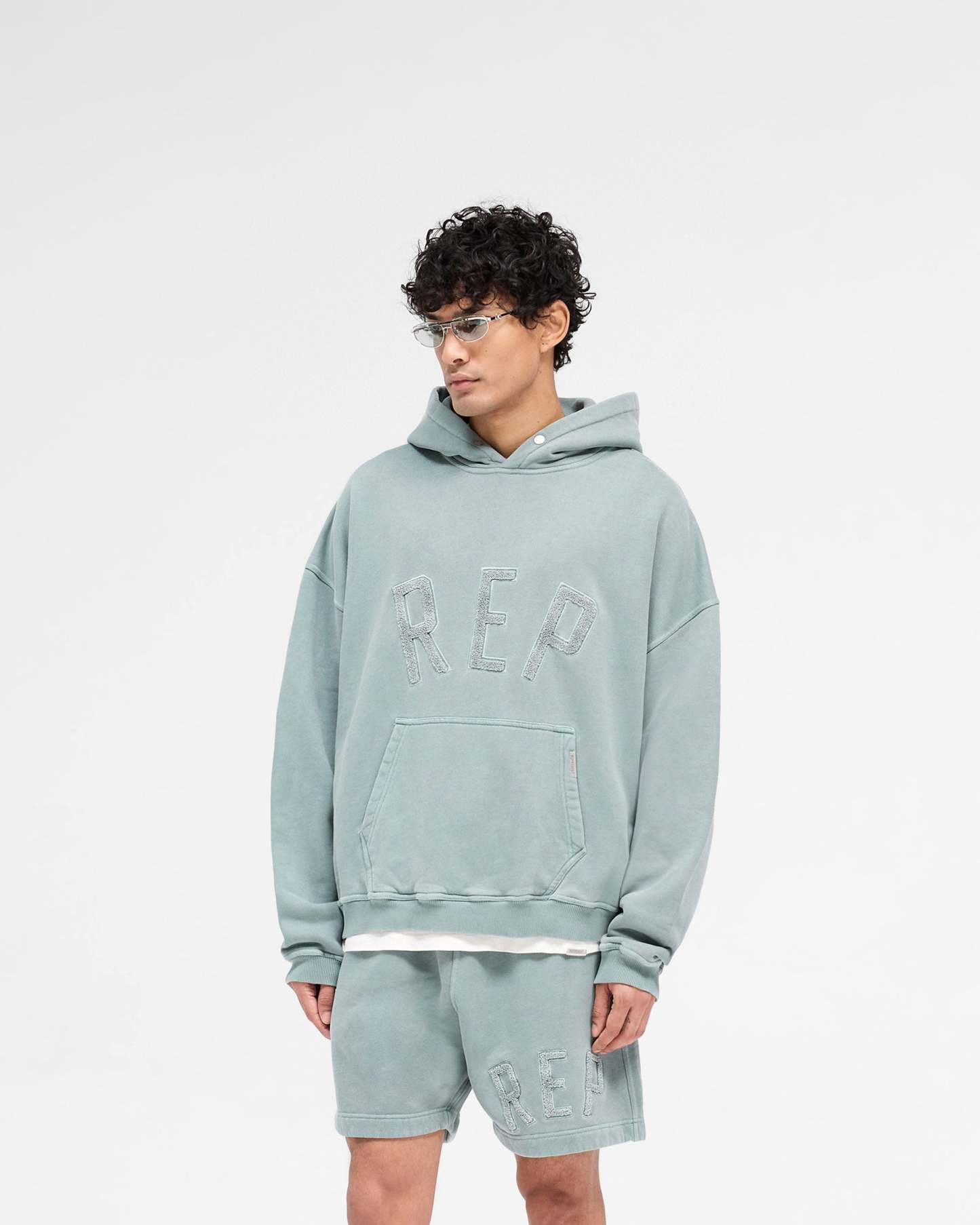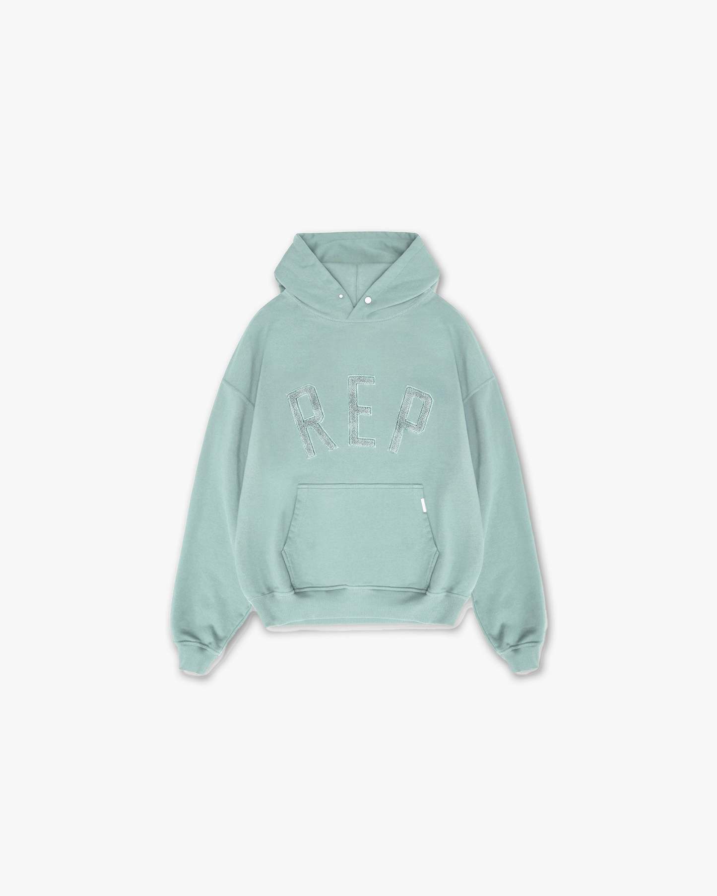 The Rep Applique Hoodie in Forest Green is crafted from brushed loopback cotton for a soft hand feel, with a boxy fit. It showcases a textured Rep applique to the front, finished with our signature metal bar logo to the pocket.