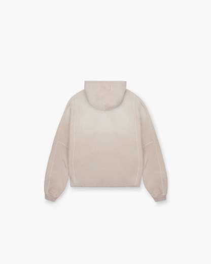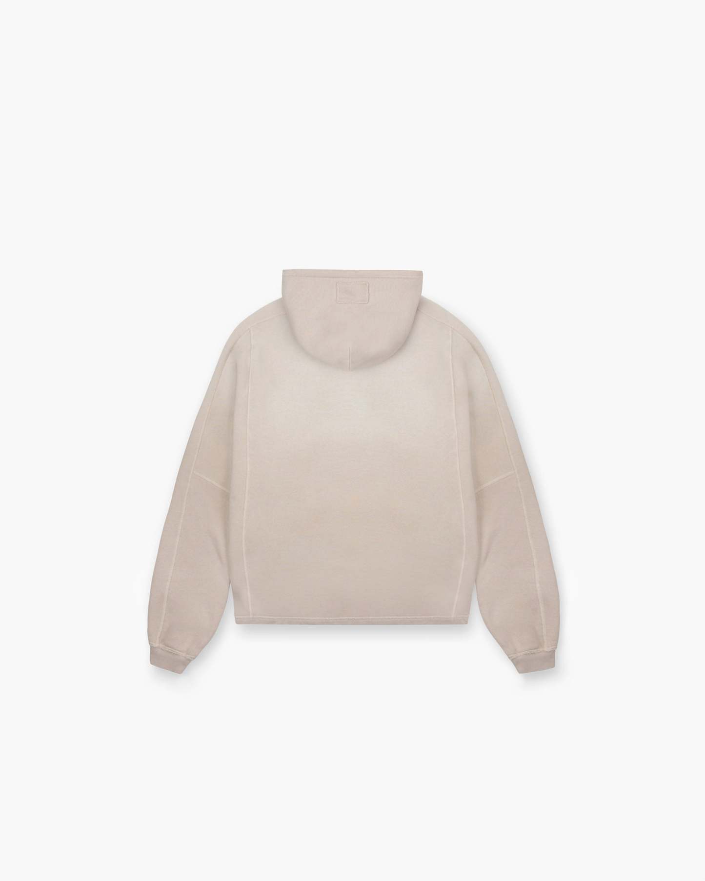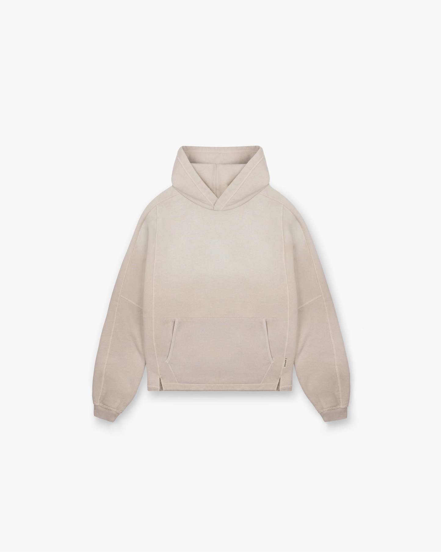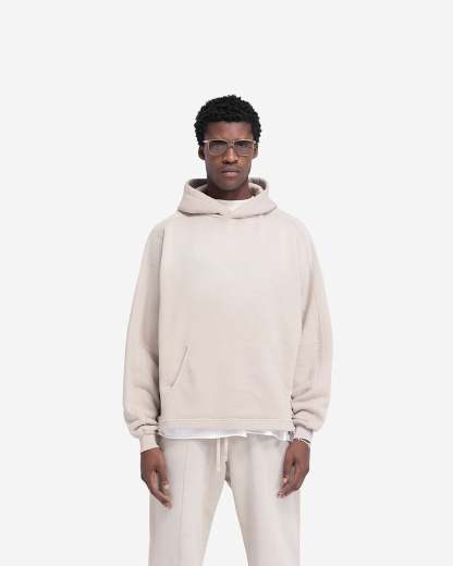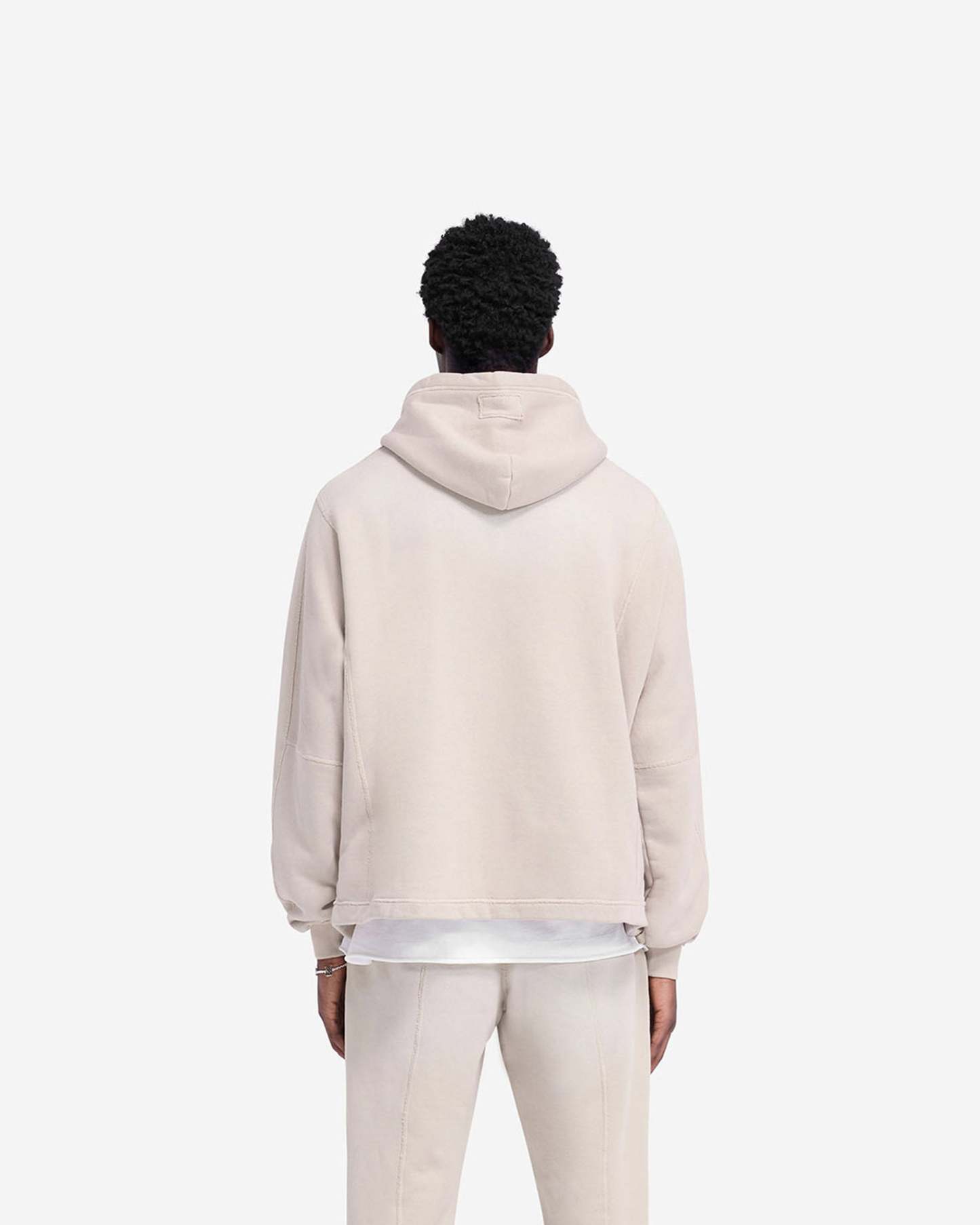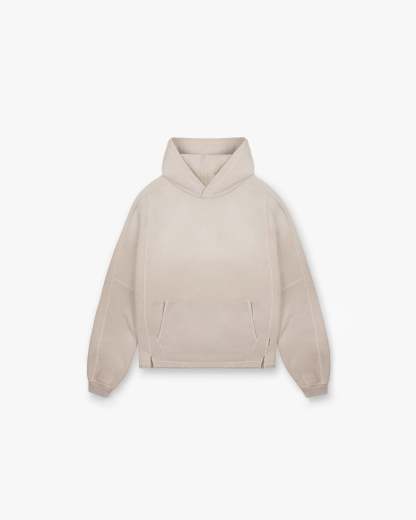 Introducing the Stepped Hem Hoodie in Oat, a luxury oversized hoodie crafted with a sun fade wash for an authentic vintage look. The hoodie showcases a split stepped hem, with a ribbed trim edge to the pocket. It is finished with a self fabric raw edge patch to the hood, and a Represent branding tab to the side seam.